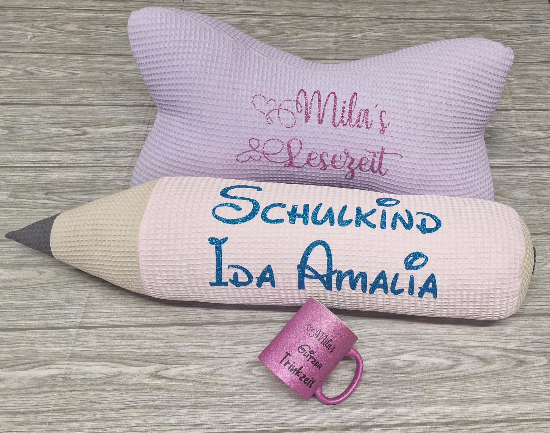 XXL Leseknochen, Schulstift- Kissen und die bedruckte Glitzertasse